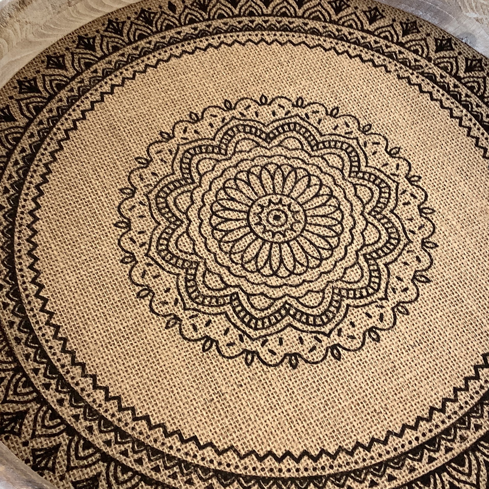 Round medallion trays with leather handles. Small is 13” in diameter. Large is 16” diameter.